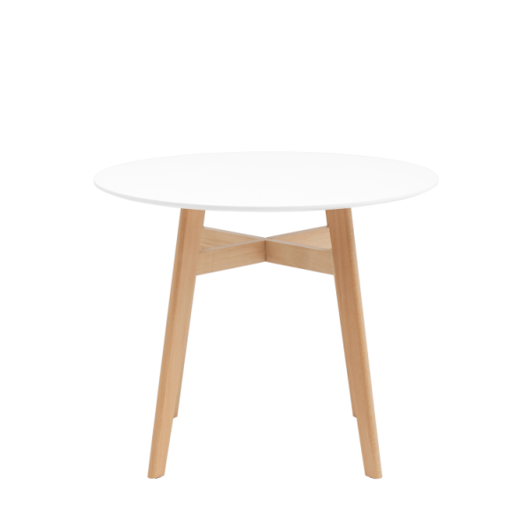 Круглая столешница выполнена из МДФ, окрашенного в белый цвет. Ножки стола изготовлены из массива дерева.
